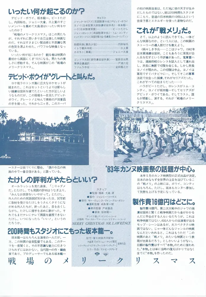デヴィッド・ボウイ、坂本龍一、ビートたけし、いずれも本職の俳優でないにもかかわらず、その演技はどれも一世一代の名演となっています。